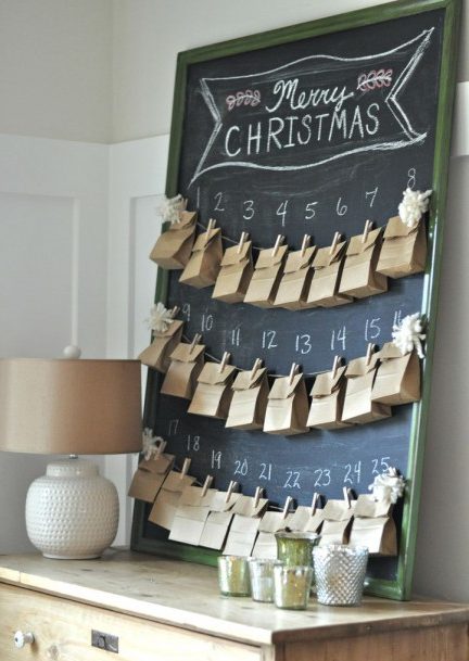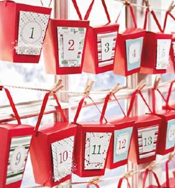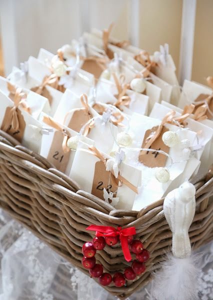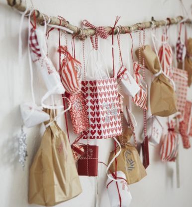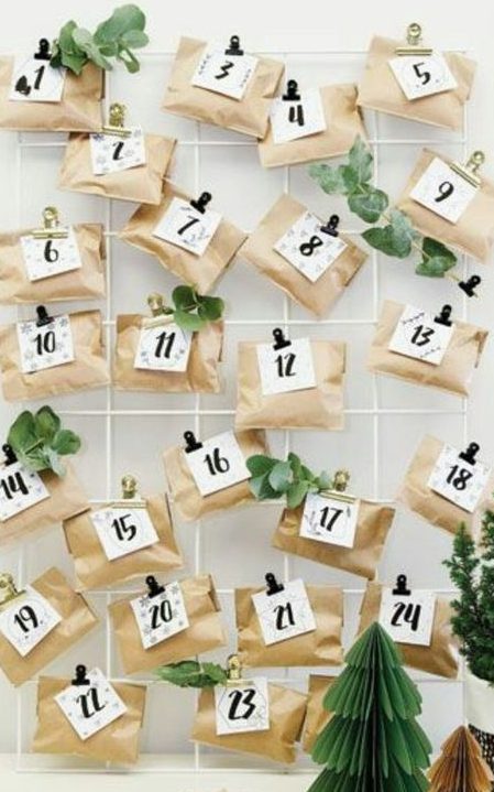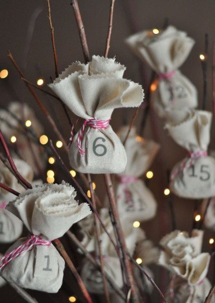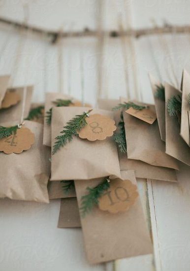 Адвент-календарь из бумажных пакетиков или мешочков. Небольшие пакетики и мешочки из бумаги или ткани можно купить или сделать своими руками. Оформить их можно в виде гирлянды или красиво расставить.