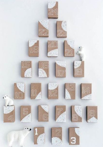 Выложить коробочки адвент-календаря можно самым различным способом: в ряд, один на другой, в форме елки и т.д.