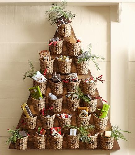 Очень интересный и вариант деревянной елки с корзинками или мешочками.