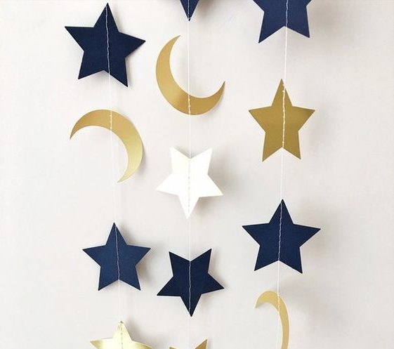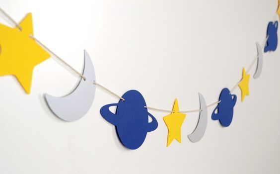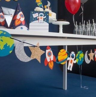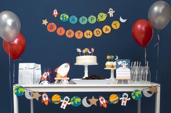 Конечно же, для оформления Дня рождения можно и нужно использовать баннеры и гирлянды. Это может быть надпись «С Днем рождения». Также помещение для праздника можно украсить гирляндами из бумажных планет, звезд, ракет и космонавтов.