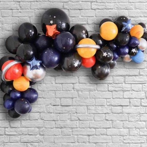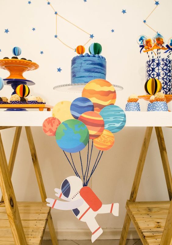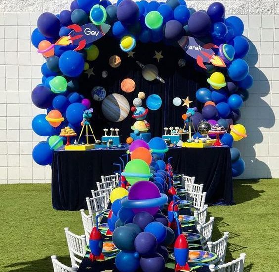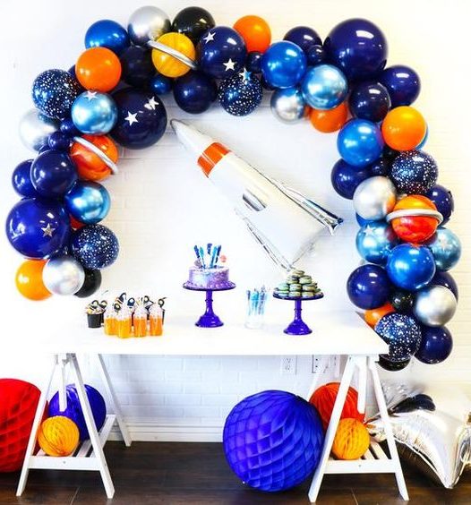 Очень эффектно в оформлении праздника в космическом стиле смотрятся воздушные шары: одиночные или целые гирлянды. Также они могут быть стилизованы под планеты.