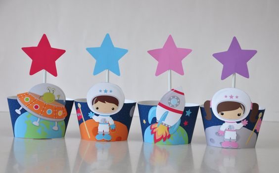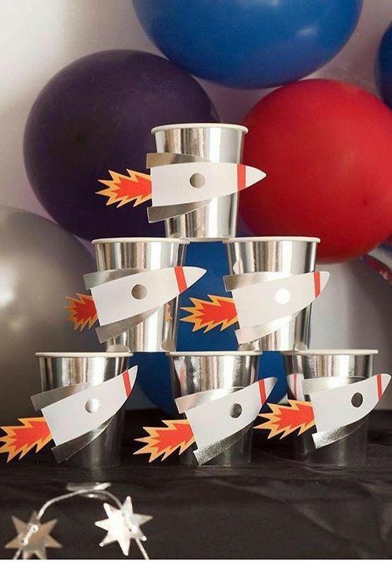 Стаканчики для напитков тоже можно украсить ракетами, космонавтами, звездами или планетами — все зависит от ваших возможностей и фантазии.