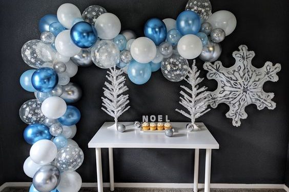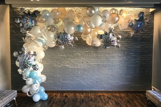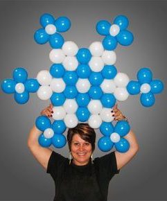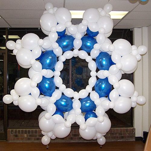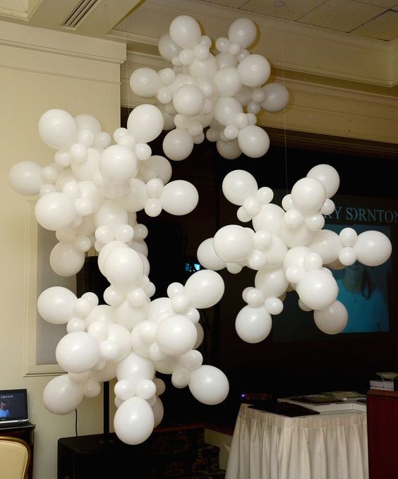 Снежинки из воздушных шаров идеально подойдут для большого помещения с высокими потолками.